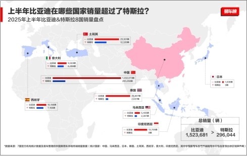 随着全球化业务的快速推进,比亚迪在海外多个市场,包括意大利、西班牙、土耳其、日本、泰国、印度尼西亚、马来西亚等一系列特斯拉深耕多年的市场,比亚迪均实现了赶超。