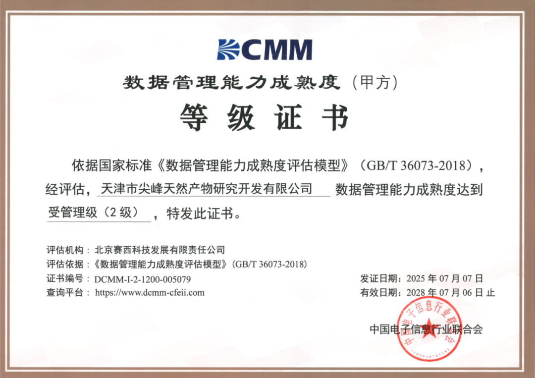 7月7日,中国电子信息行业联合会公布最新一批获得国家数据管理能力成熟度等级证书的企业名单,天津市尖峰天然产物研究开发有限公司获得DCMM(数据管理能力成熟度)受管理级(二级)认证。